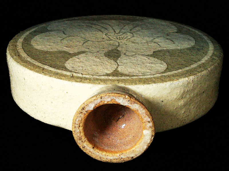 Características formais: Garrafa decorativa construída a partir de elementos agregados. A base e a boca, modeladas no torno, têm pequeno diâmetro, e o bojo, recortado em placas, está montado em formato de círculo. A peça recebeu camada de engobe branco, em seguida, raspada para desenhar motivo de flor com a técnica sgraffito centralizado nas duas faces circulares. A peça está recoberta por camada de engobe não foi raspado para delinear a flor. Sua superfície apresenta leve brilho e textura lisa.