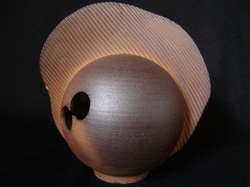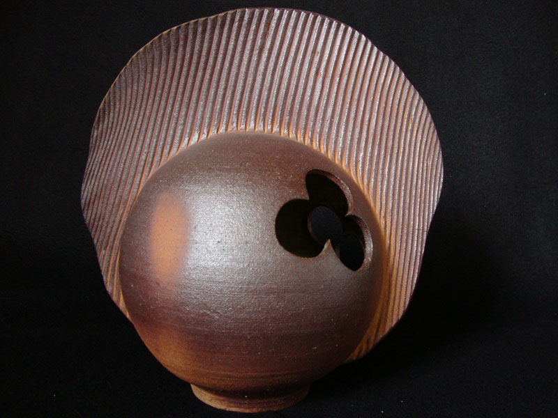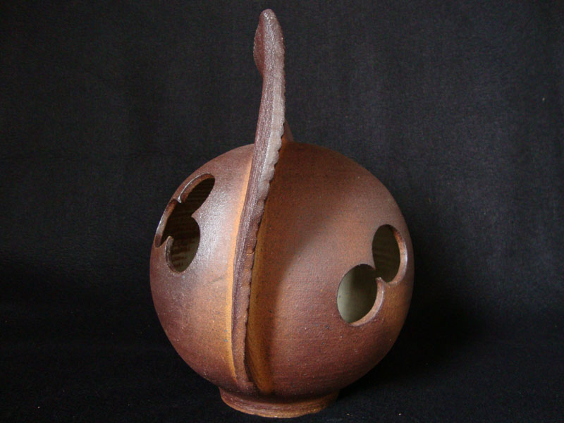 Características formais: Escultura em forma de esfera modelada em torno, com círculos recortados na superfície. A cerâmica é dividida por placas de argila recortada e aplicada sobre a curva do topo.