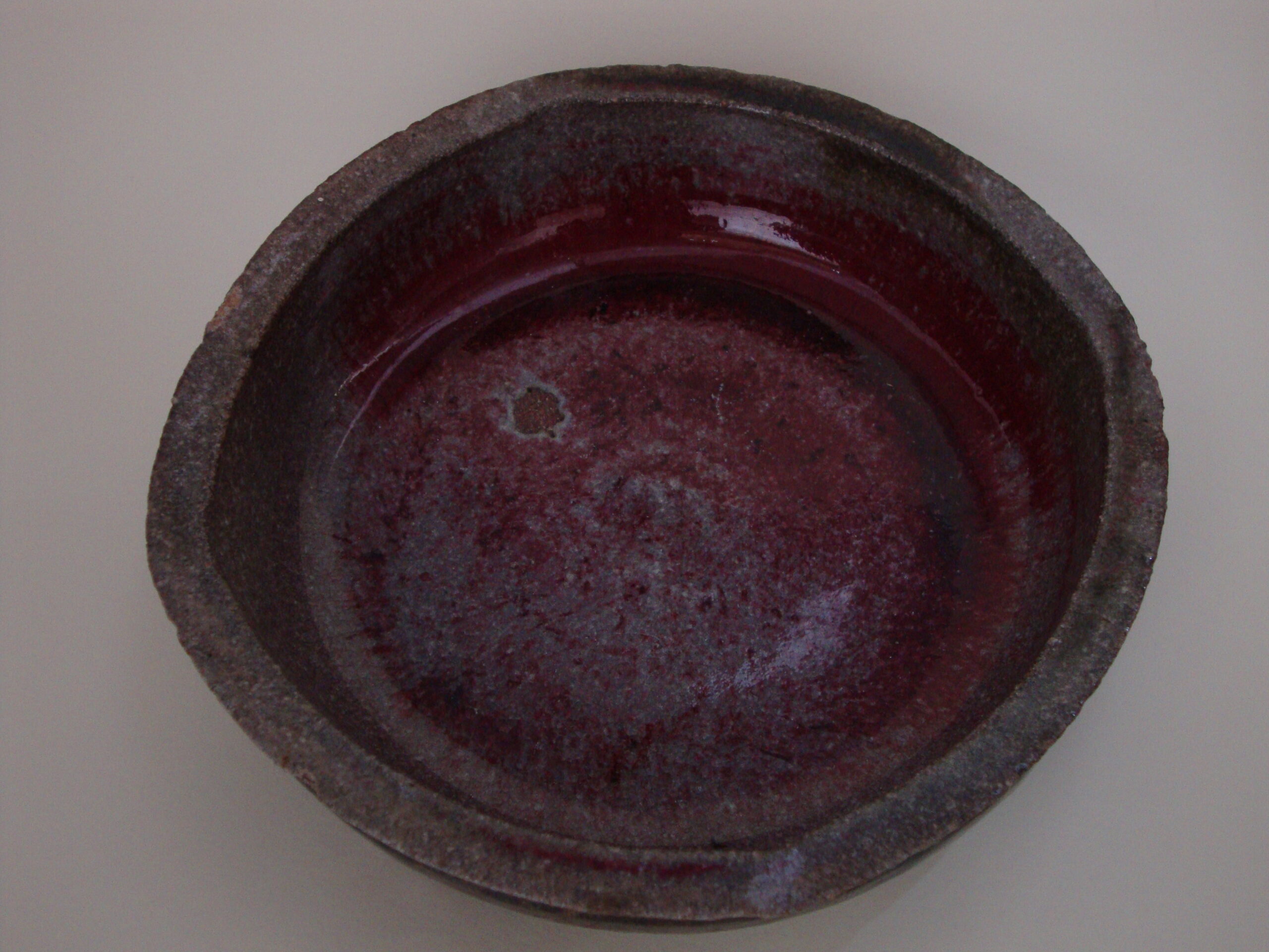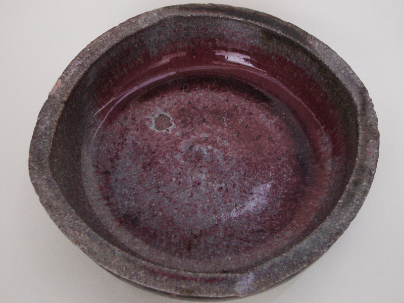 Características formais: Travessa torneada com deformações intencionais na borda que aproximam de forma de um quadrado. A superfície interna recebe esmalte contendo cobre, adquirindo tom de cinza dominando com manchas em vermelho intenso (sangue de boi ou 'shinsah'), decorrentes de tentativa de redução ocorrido durante a queima em forno à lenha. A superfície externa apresenta esmalte negro brilhante, indiciando a aplicação de esmalte contendo ferro. Seu aspecto geral é brilhante e sua textura, lisa.