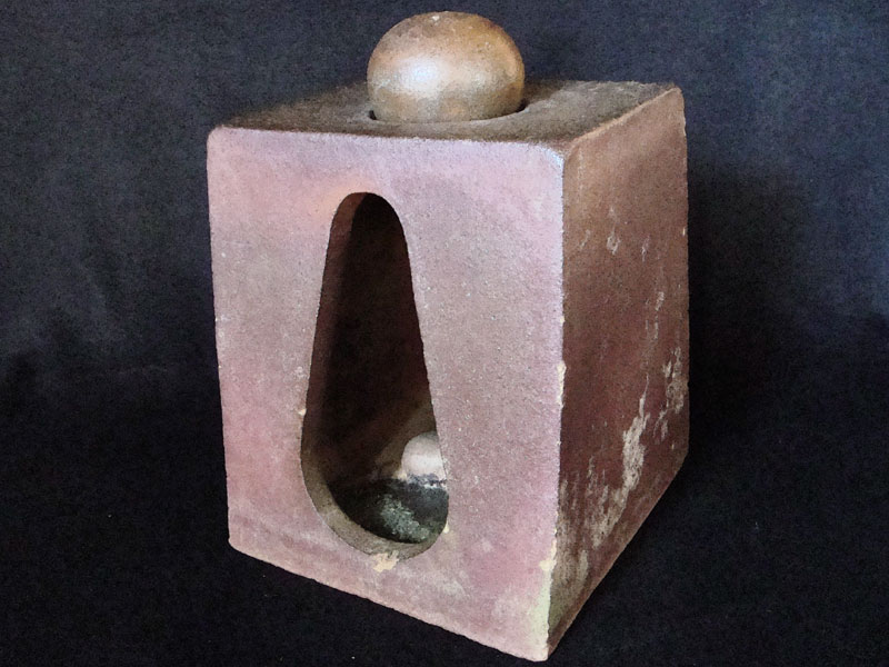 Características formais: Forma tridimensional quadrada com escavação na parte superior onde a saliência adentra em forma de cone, encontrado com modelagem sinuosa, aplicação de engobe parcialmente; uma bola torneada e esmaltada completamente a abertura superior; restante da obra cor natural da argila.