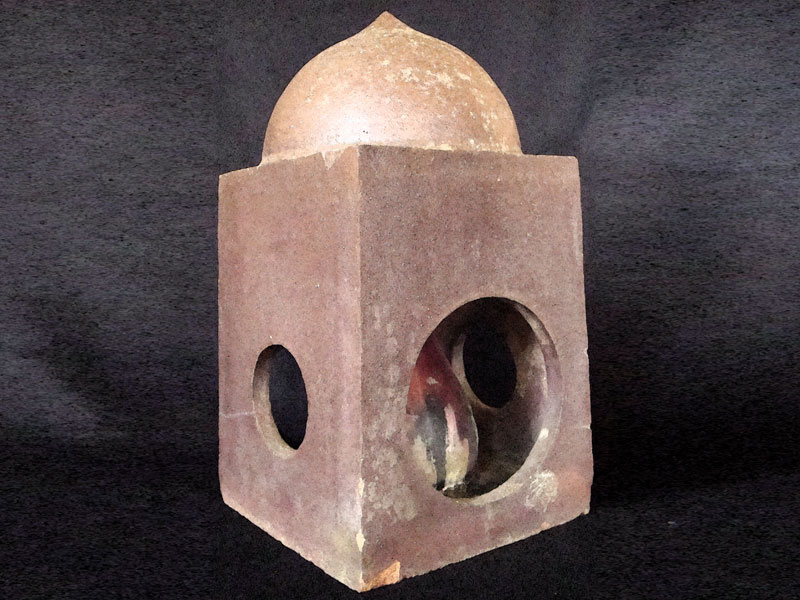 Características formais: Forma tridimensional quadrada, com abóbada na parte superior sugerindo uma cúpula de catedral na parte de frente. Atrás, há recorte circular até a metade da obra. Nas outras laterais há um círculo mencionado de cada lado e, internamente, um cone torneado com aplicação de fragmentos de vidro derretido na queima.