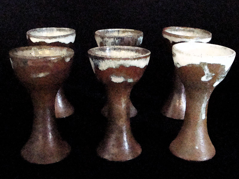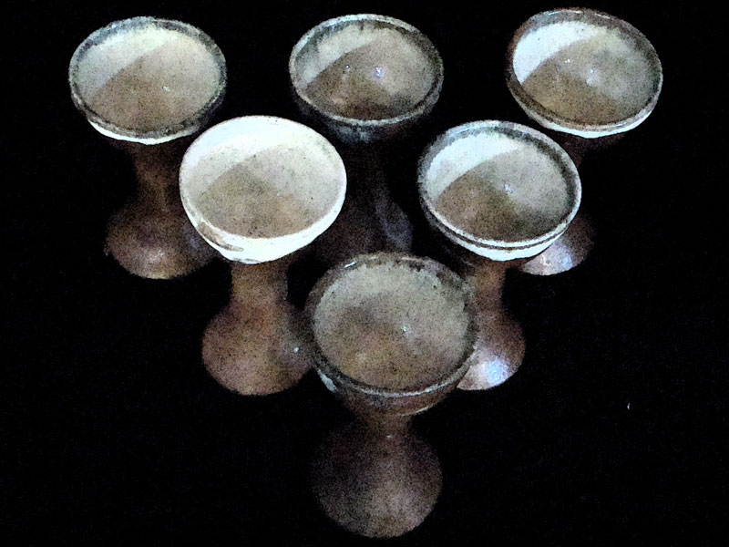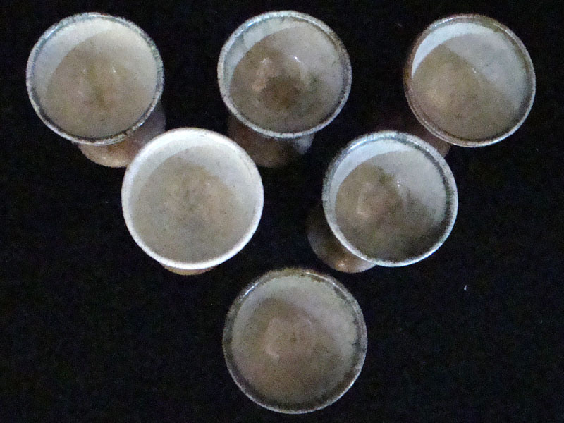 Características formais: Conjunto de 6 tags de pé alto de formato arquetípico sem decorações tridimensionais. Esmalte do brando dentro e transbordando e fora marrom ferro.