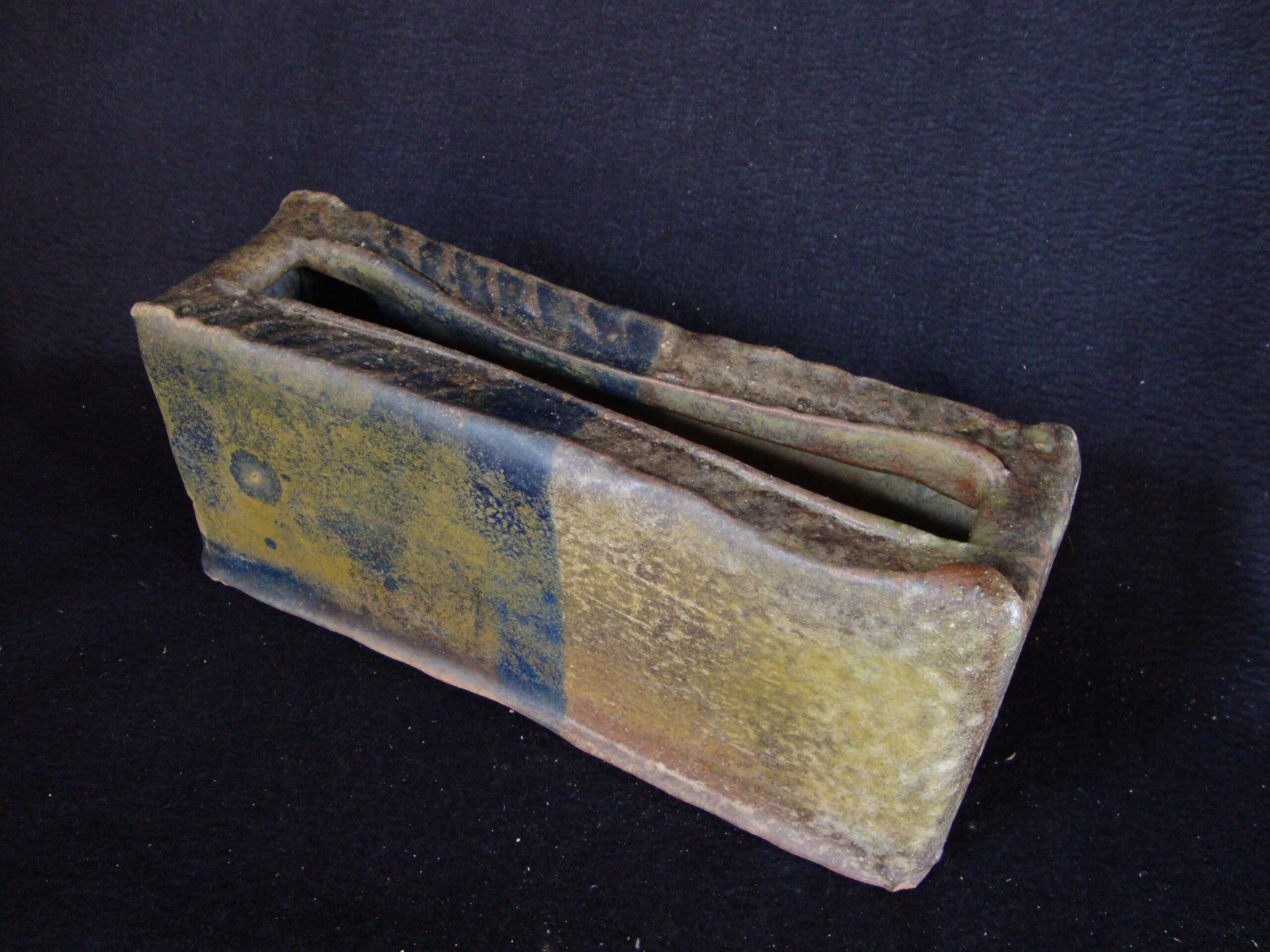 Características formais: Caixa em forma de paralelopípedo com rasgo longitudinal na face superior, esmaltado com dois esmaltes de cores diferentes.