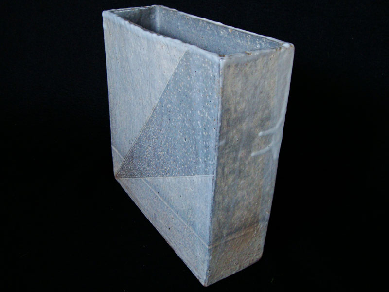 Características formais: Vaso modelado com placas de argila em forma de quadrado. Recebe decorado com desenho geométrico obtido a partir da técnica sgraffito (raspagem de parte da camada de engobe aplicada na superfície) e textura em baixo relevo produzido com ferramenta. Revestido com vidrado transparente, adquire tonalidades de cinza a aspecto semi mate.