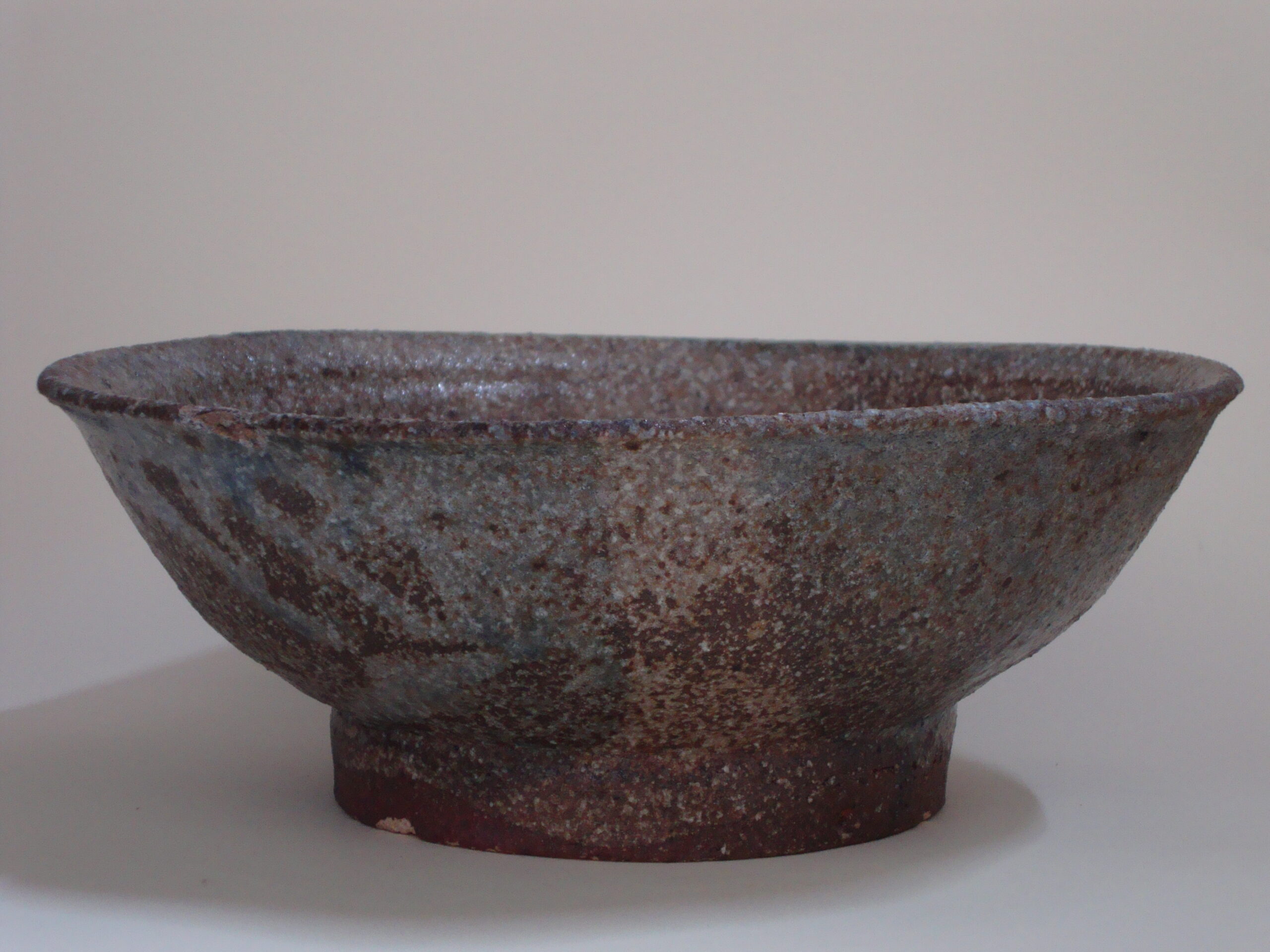 Características formais: Tigela torneada, de textura rústica, apresentando irregularidades na superfície interna. Inteiramente esmaltada com vidrado transparente que adquire tons de marrom e cinza. Apresenta manchas azuis resultantes de depósitos de cinzas de lenha ocorridos durante a queima.