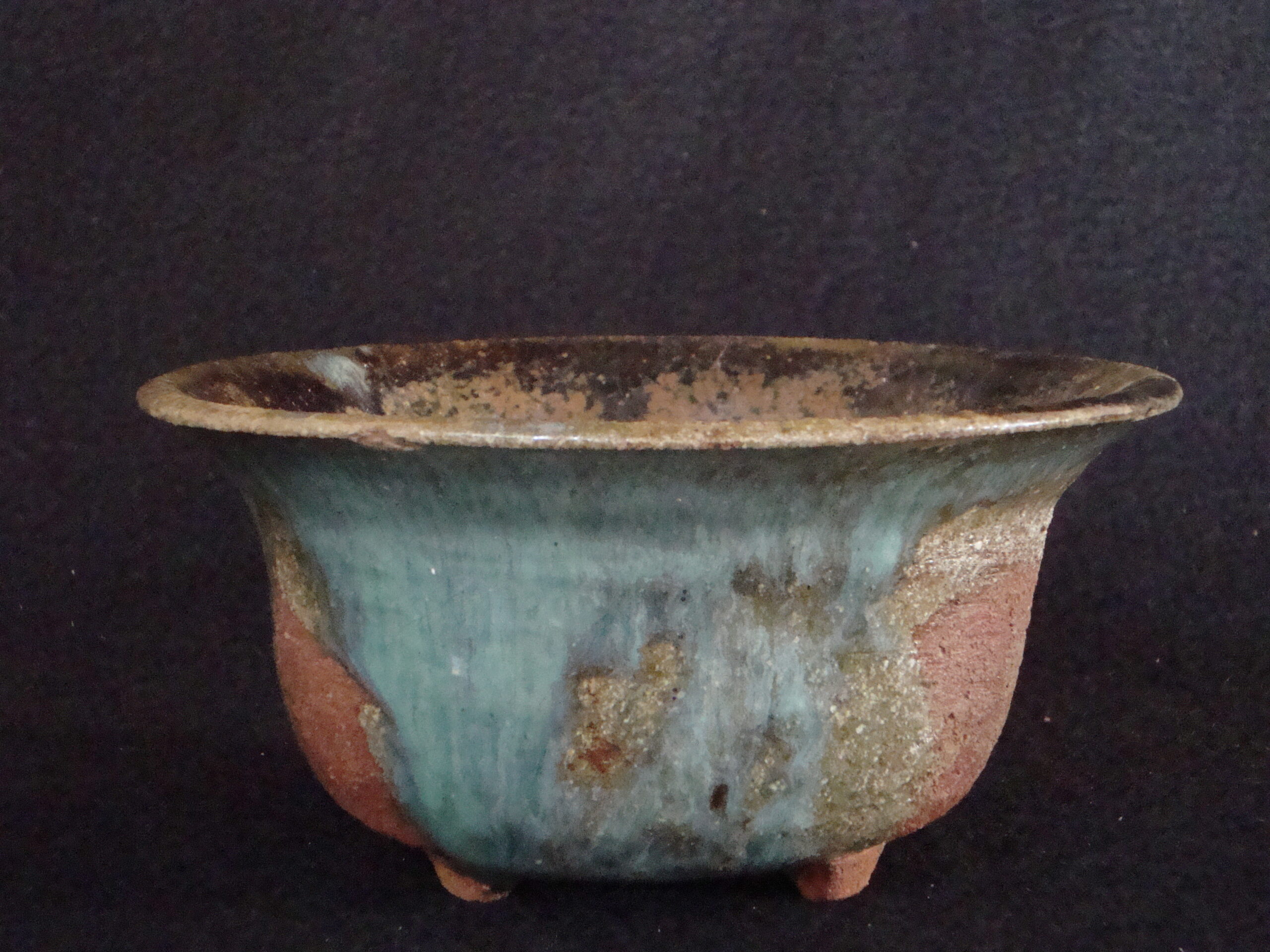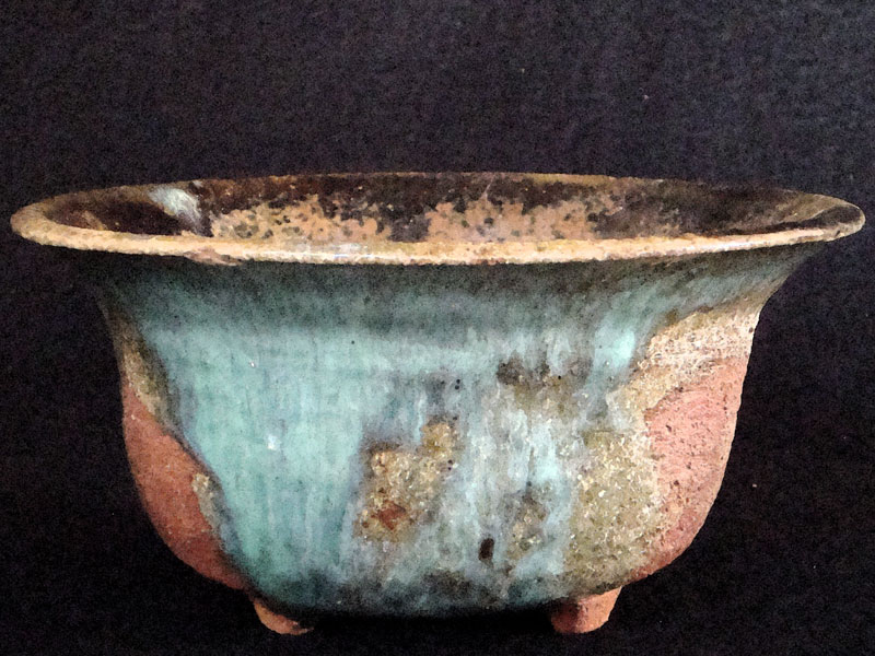 Características formais: Tigela torneada, de borda ampla, maior que seu diâmetro médio, com três pequenos pés modelados manualmente. Parcialmente recoberta com diferentes tipos de esmaltes: negro e esmalte transparente semi brilhante e esmalte em tons de azul e terra contendo cobre. Mistura que resulta em superfície irregular de cores e texturas variadas entre áreas esmalatadas de tons azul, marrom e negro e áreas onde se vê a cor da argila sinterizada.