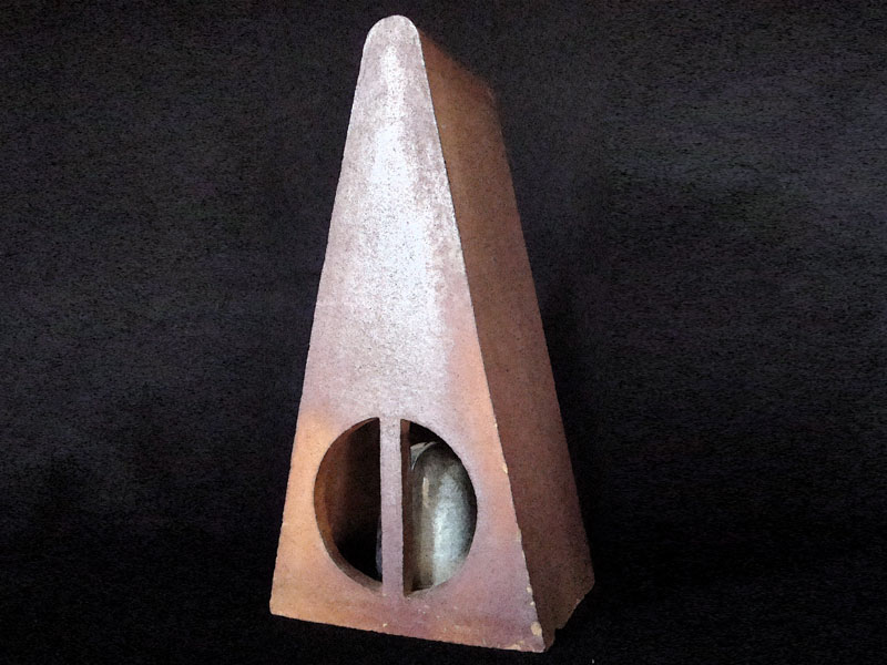 Características formais: Forma tridimensional triangular no formato de igreja, abertura circular na parte inferior com separação reto no centro da abertura, internamente forma arredondada, torneada e esmaltada com efeito da queima