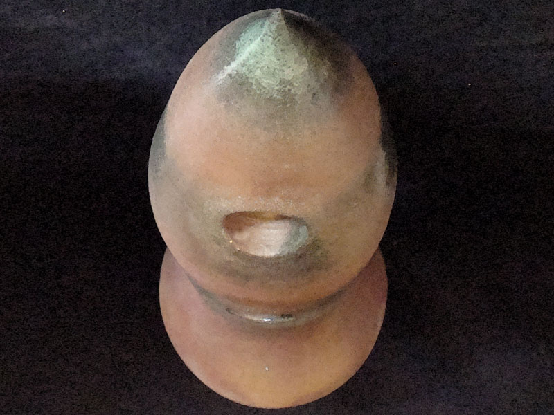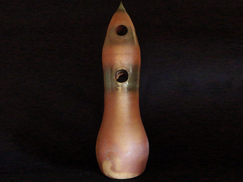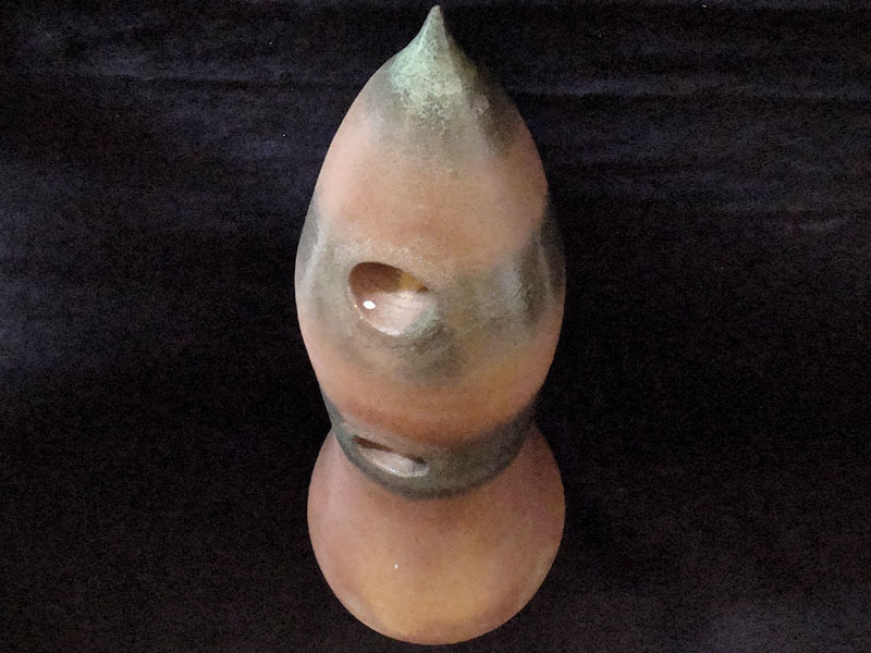 Características formais: Escultura com formato de bojo na base, afinando levemente para alongar no processo de torneamento até atingir o ápice na ponta. Dois pontos distintos são perfurados e esmaltados na parte superior da peça.