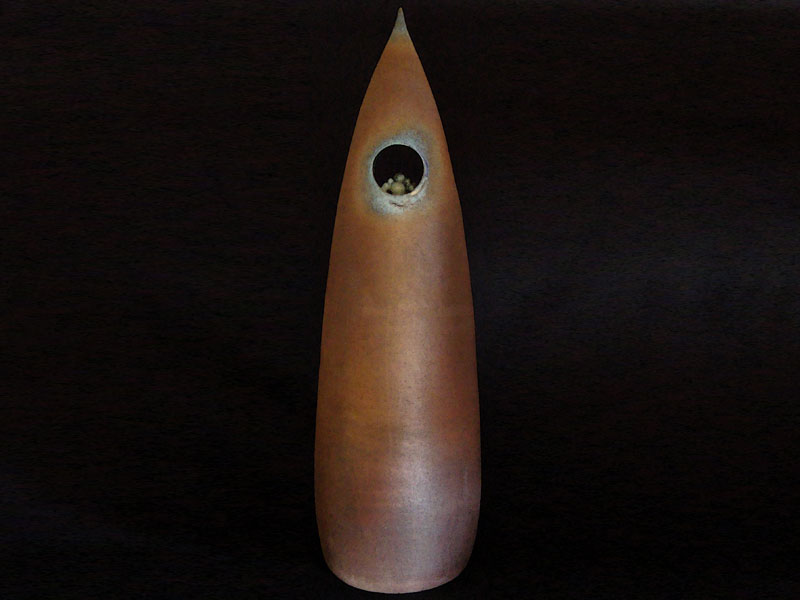 Características formais: Escultura torneda em forma de fuso terminado em ponta, abertura na parte superior, com forma habitual onde elementos esféricos de tamanhos diversos e agrupados sugerem união. O esmalte azul na abertura adentra dando transparência. O elemento agrupado destaca-se pela cor branca.
