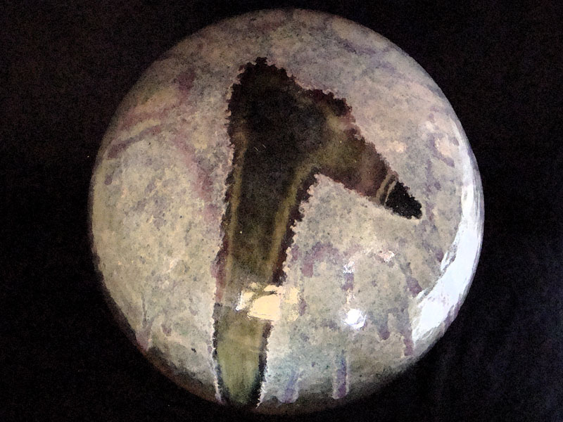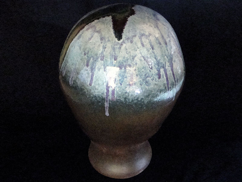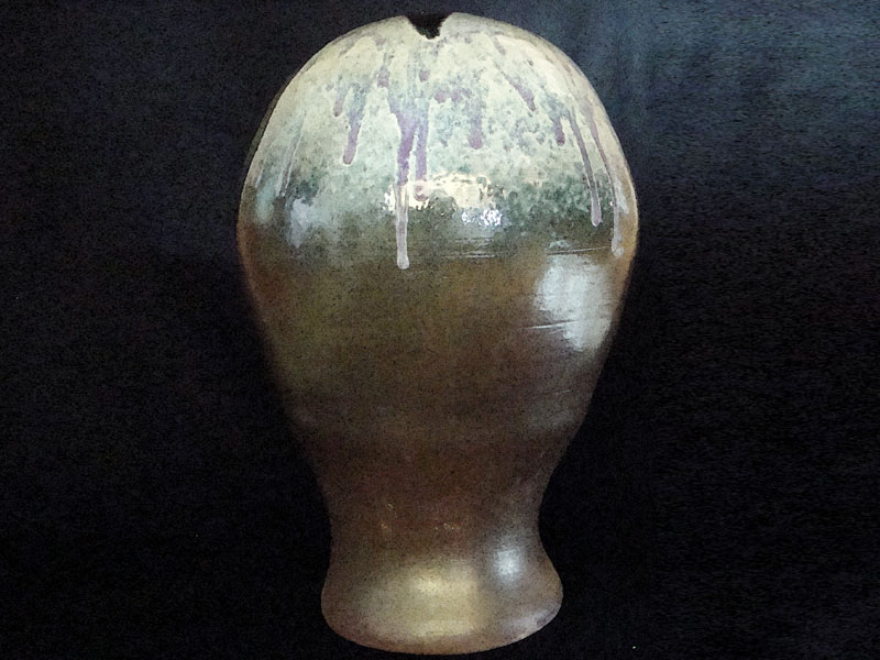 Características formais: Escultura torneada, com base pequena, alongado até o topo em forma de lâmpada. A esmaltação com aplicação de vidro, na queima produziu efeito de cores iluminando a lâmpada em contraste com a argila sinterizada.