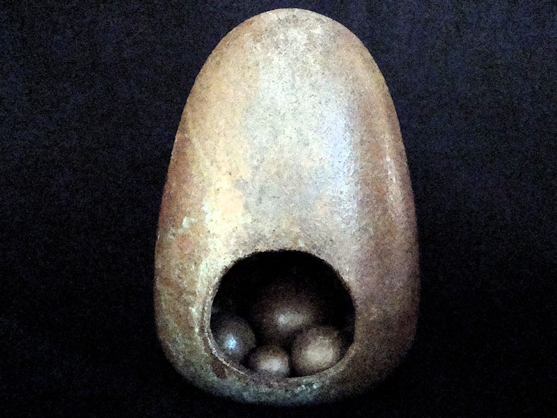 Características formais: Peça torneada em formato de um grande ovo com uma abertura no centro e base contendo varias bolas menores no interior da peça.