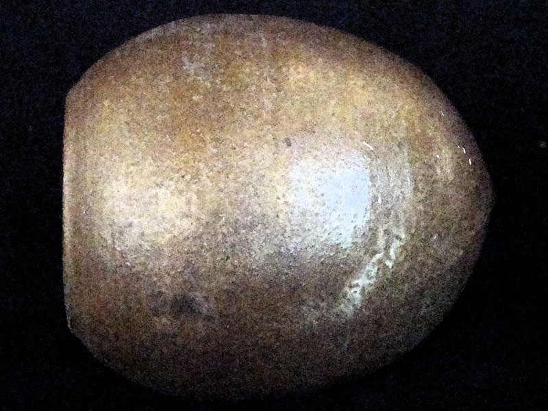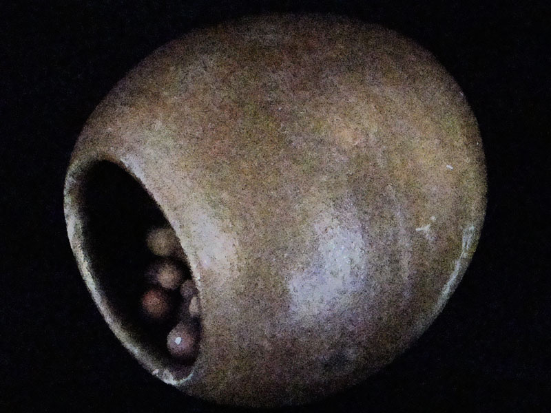 Características formais: Peça torneada em formato de um grande ovo deitado com uma abertura na ponta de frente com varias bolinhas no interior da peça. Contendo esmalte em toda a parte exterior da peça.