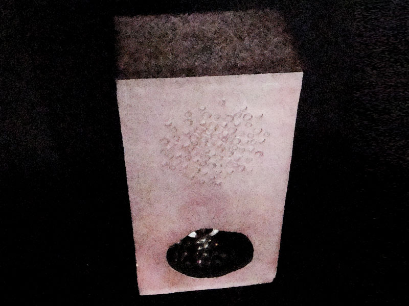 Características formais: Apelo vertical, oco, com abertura quase circular situada perto da base frontal da face frontal do objeto. A caixa não tem semelhança e é habitada por elementos esmaltados: cumbuca com esmalte branco de aparência de leite saindo, em cascata, seres com esmalte marrom. A metade superior da face frontal também abre e aborda possui uma área circular dirigida de marcas de carimbos circulares.